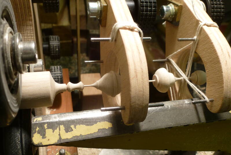 Und wenn ein Element anfängt, stärker zu vibrieren, wird eine Fadenlünette gesetzt. Dabei wird ein Baumwollfaden jeweils einmal aus jeder "Himmelsrichtung" in einer Schlaufe um die Seele des Werkstücks gelegt (eben anliegend). Nun wird die Vibration sicher unterbunden und der bereits fertiggestellte Teil des Fadens läuf ruhig und sicher mit, ohne durch Fliehkräfte zerstört zu werden.