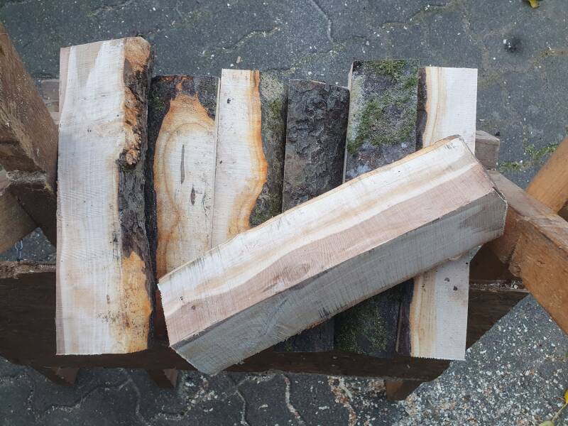 So sind z.B. für Pfeffermühlen selbst erzeugte Kanteln in erlebbarer Zeit und hoffentlich ohne zu großen Ausschuss zu trocknen. Aus Aststücken werden also Kanteln gesägt und die Enden mit Wachs versiegelt; das reduziert die schnelle Verdunstung an den angeschnittenen Poren der Stirnseiten, und reduziert damit die beim Trocknen auftretenden Spannungen. Jetzt müssen wir warten, bis sie trocken sind ...