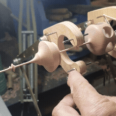 Und wenn ein Element anfängt, stärker zu vibrieren, wird eine Fadenlünette gesetzt. Dabei wird ein Baumwollfaden jeweils einmal aus jeder "Himmelsrichtung" in einer Schlaufe um die Seele des Werkstücks gelegt (eben anliegend). Nun wird die Vibration sicher unterbunden und der bereits fertiggestellte Teil des Fadens läuf ruhig und sicher mit, ohne durch Fliehkräfte zerstört zu werden.