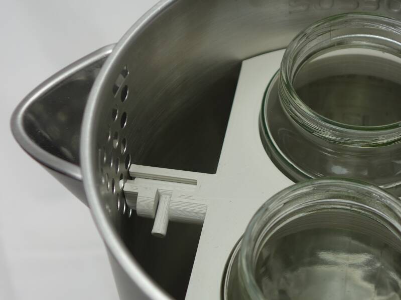 Ein (wie ich zugeben muss) etwas aufwändig konstruiertes (3D-gedrucktes) Gestell hält zwei Babynahrungsgläschen in einer für die spätere Leimentnahme bequemen Höhe. Die abgeschnittenen Seiten vorne und hinten erlauben zum einen das Einsetzen in den Kocher trotz des nicht ganz senkrecht zu stellenden Kocherdeckels und stellen zum anderen gute Zirkulation des im Bodenbereich erhitzten Wassers sicher. Außerdem ist es möglich, den Kocherdeckel mit eingesetzten Gläschen zu schließen; so läßt sich die Verdunstung minimieren, wenn der Leim vorbereitet oder längere Zeit nicht gearbeitet wird.