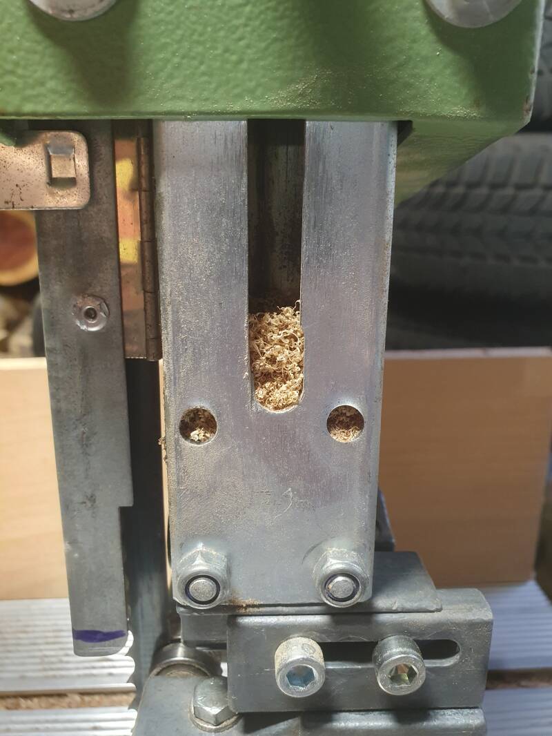 Weil das Profil, mit dem die Sägebandführung oben offen ist (war bei meiner Säge von Anfang an so), wird es leider im Betrieb immer mit Spänen gefüllt, was die Verstellung nach ganz oben verhindern kann.