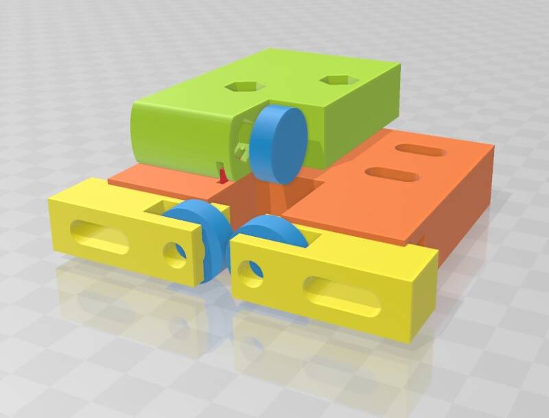 An dem Träger (orange) werden vorne die beiden Halter für die Seitenrollen (gelb) befestigt; diese sind über Langlöcher einzeln seitlich verstellbar.