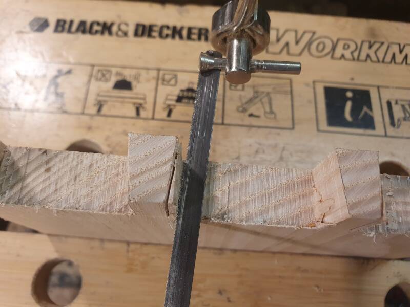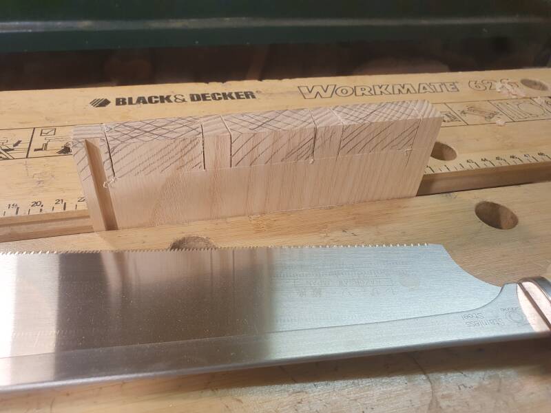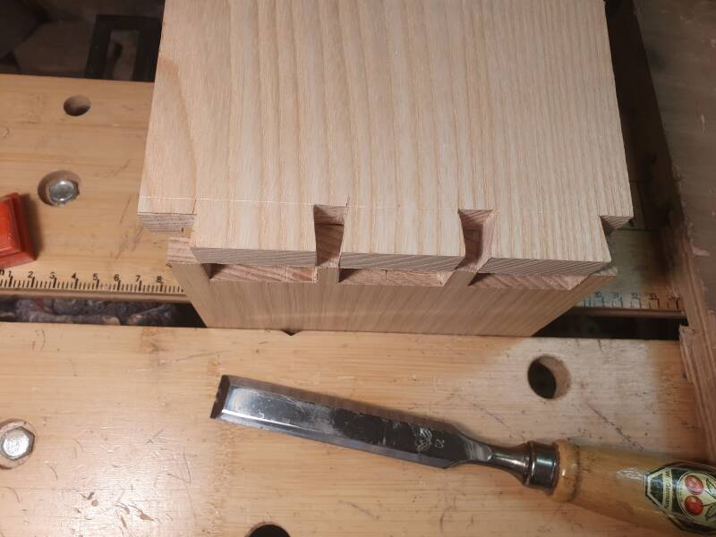 Dann wurden die Verzinkungen aufeinandergesetzt und die Flanken mit dem Stechbeitel so angepasst, dass Schwalbenschwänze und Zinken stramm ineinanderpassen. Ein probeweises Zusammenklopfen der Verbindung stellt dies sicher.