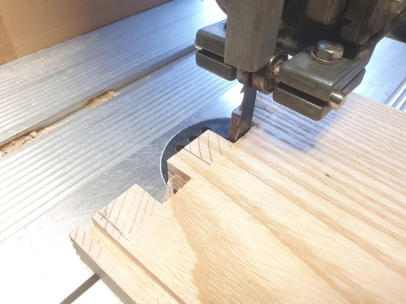 ... mit der Bandsäge auf geringere Stärke aufgetrennt und mit etwas Übermaß auf die erforderliche Breite zugeschnitten ...