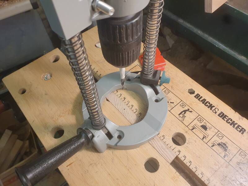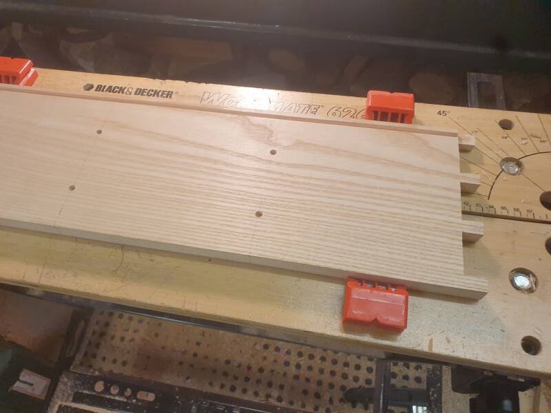Für die Verbindung der Innenwände an Vorder- und Rückseite wurden Dübellöcher markiert und gebohrt (links Vorder- und Rückseite, rechts Innenwand):