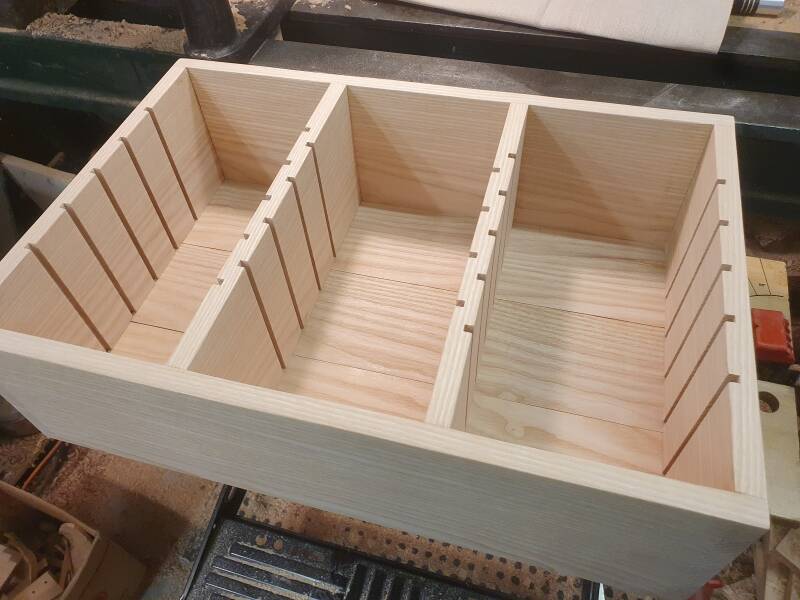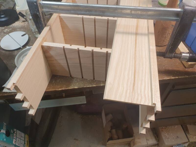 Zur Kontrolle, ob alles passt, wurde die Box einmal zusammengesetzt, dann Front und Rückseite mit den beiden Innenwänden verleimt, und die eine Seitenwand eingeleimt ...