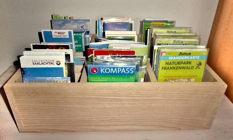 Es gibt tatsächlich noch Leute, die lieber mit einer Wanderkarte in die Natur gehen, als mit einer Karten-App. Ich gehöre auch dazu; und für einen anderen Wanderkarten-Fan habe ich eine Box gebaut, in der er seinen großen Bestand an Wanderkarten gut sortiert aufbewaren kann.